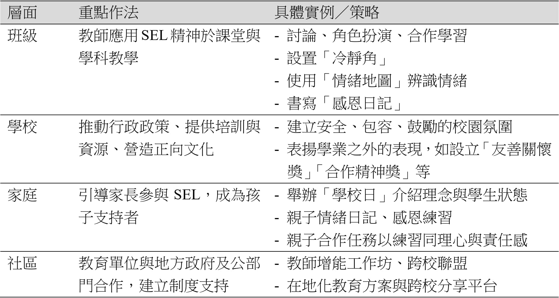 教師的幸福是推動校園SEL的起點,但唯有建立系統合作才能讓SEL真正落實到每一位學習者身上。SEL本身就是一種強調合作、共創的教育理念,需要從班級、學校、家庭到社區共同參與,形成完整的支持網絡。根據Jones與Bouffard(2012)提出的「系統合作觀」,SEL的實踐不應侷限於課堂,而是需要融入學校的整體文化,透過各層面的協作營造一致性的價值與環境,讓孩子的社會情緒發展有充足的養分。據此團隊歸納班級、學校、家庭與社區四層面的實踐建議(見表1),從課堂經營、校園文化、親子互動到社區資源相互呼應,建構多層次的支持網絡推動SEL持續落實。